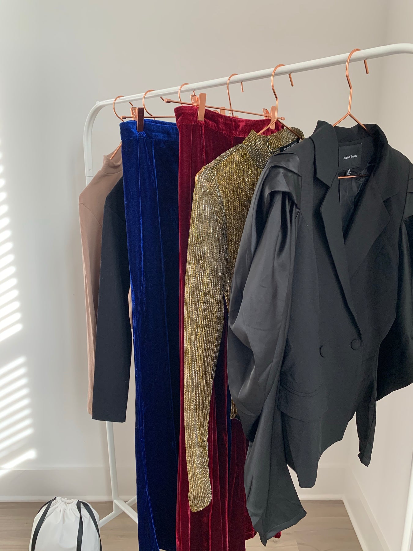 For the perfect holiday party look, style this blazer with our Burgundy or Cobalt Blue Sasha Flair Pants.